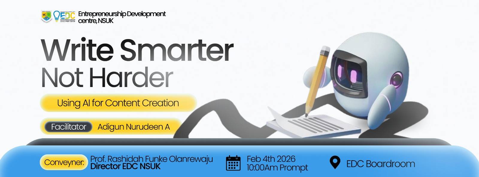 The Entrepreneurship and Development Centre (EDC) at Nasarawa State University, Keffi (NSUK) was established to ignite the entrepreneurial spirit among our students and the wider community. As a dynamic hub, EDC aims to provide innovative training, mentorship, and resources, empowering aspiring entrepreneurs to turn their ideas into impactful ventures.